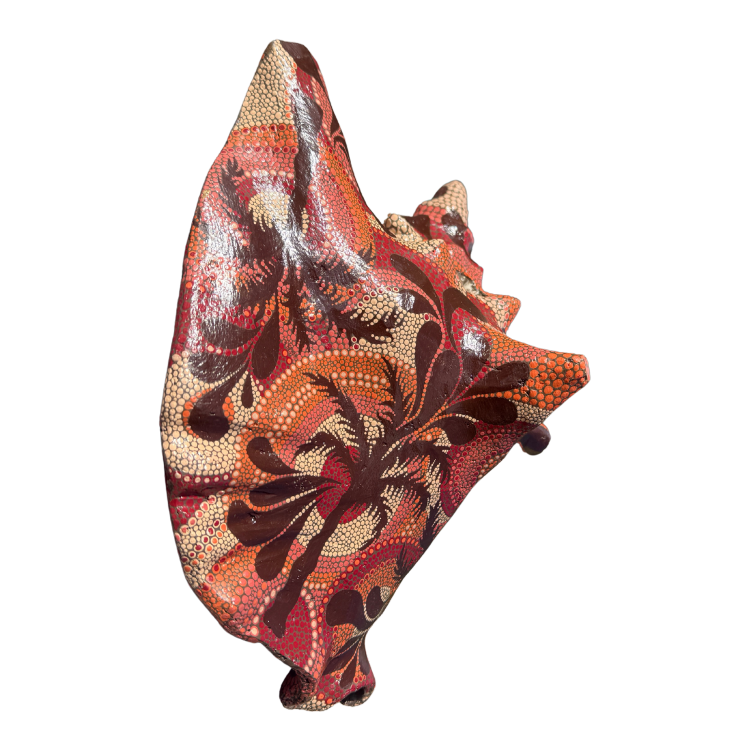 Tandem is now housed in the “V&M” (Vincent & Marina Gallery) on West Bay Street. The shell’s lip is adorned with two orchids, intertwined to symbolise unity and balance. Intricate dotted circular patterns spiral across the shell’s body, adding an elegant rhythm to the design. The orchids, known for their delicate beauty and intricate structure, represent love, strength, and resilience. Together, they embody the power of connection, with each dot reflecting the harmony and support found in unity. This piece is a testament to the strength that comes from togetherness in life’s intricate dance.