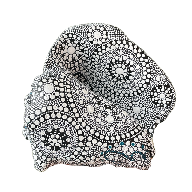Blue Serenity captures the fragile elegance of a broken conch shell, with most of its form lost except for the spiral. The remaining spiral is thoughtfully adorned with a blend of blues, whites, and gold dots that follow the shell’s natural curves. Each dot appears to flow seamlessly along the contours, creating a sense of harmony and movement. This piece highlights the delicate balance between fragility and resilience, offering a sense of serenity as the pattern breathes new life into the remnants of the shell.