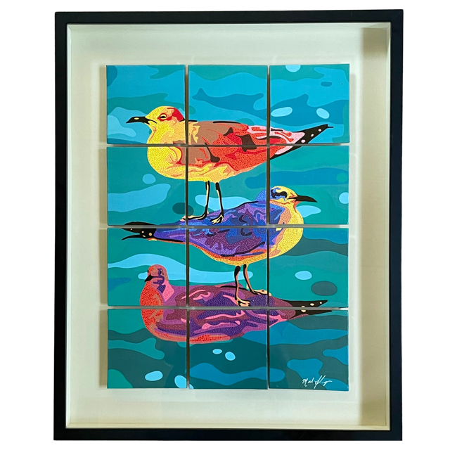 Three Gulls is one of my earliest pieces. Without access to a large canvas at the time, I assembled twelve mini canvas tiles to create a single, cohesive image.